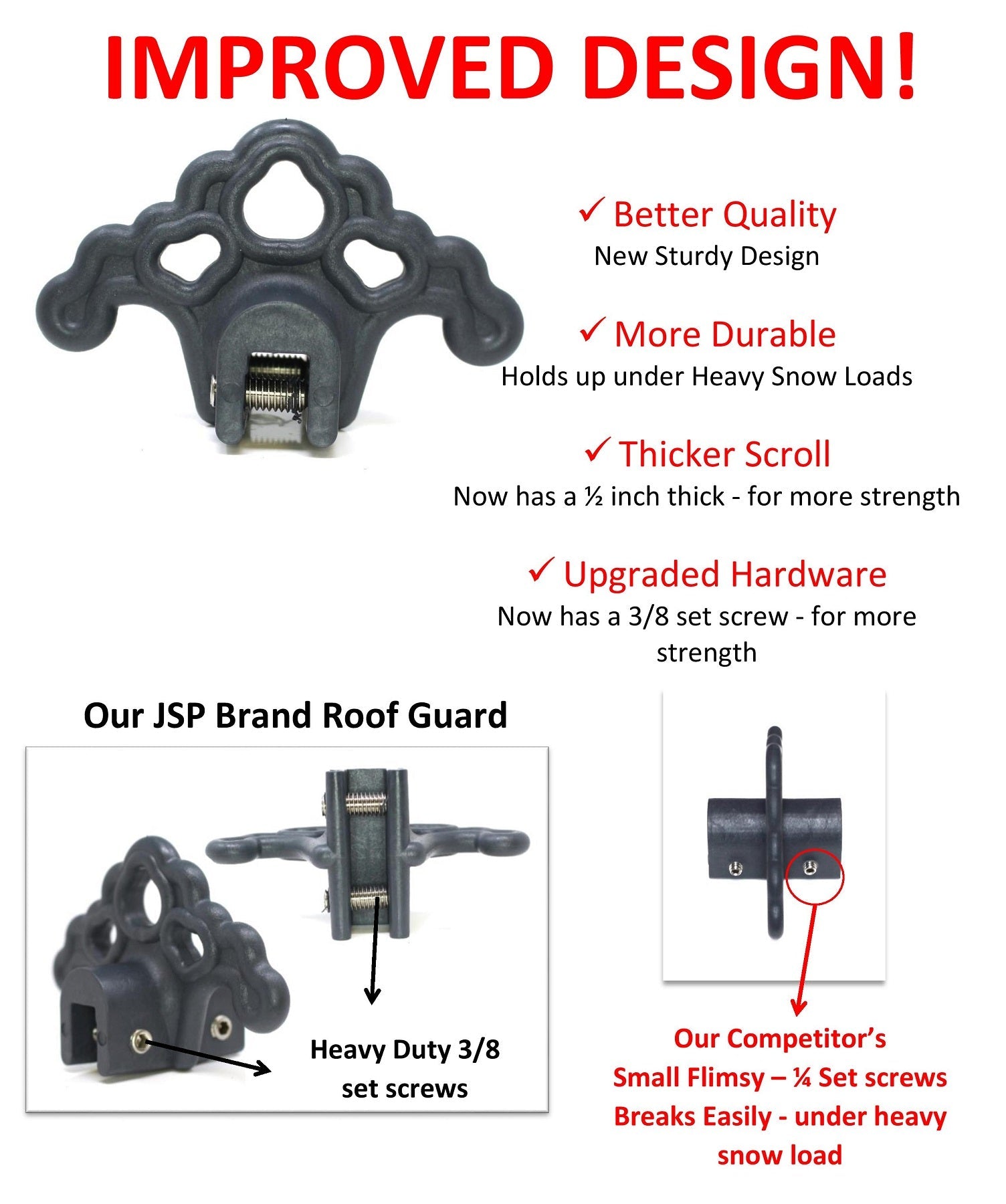 Our JSP Brand Plastic Standing Seam Roof Snow and Ice Guards have a New & Improved Design. Our new design are stronger and more durable, these heavy duty guards are designed to last! They are designed to keep snow and ice off standing seam metal roofs. Featuring upgraded hardware, that will hold up better under the pressure of snow and ice. These strong and durable guards will protect your property and people from injury and liability claims from injury. Prevent Sliding Snow Ice Buildup..